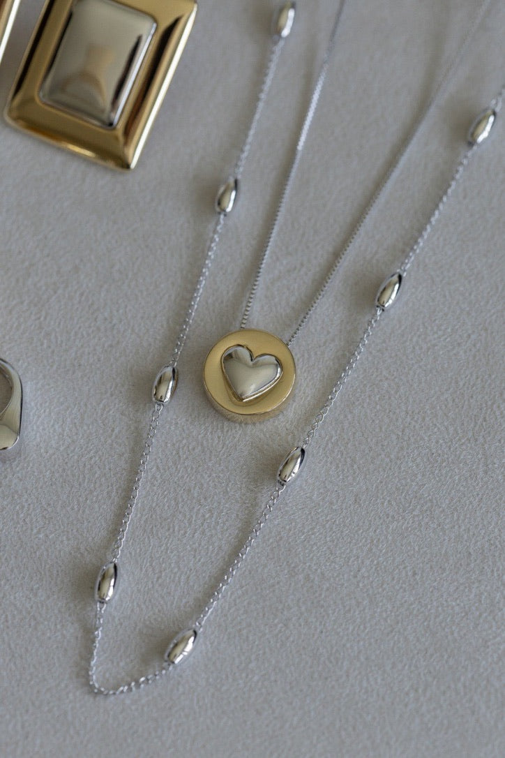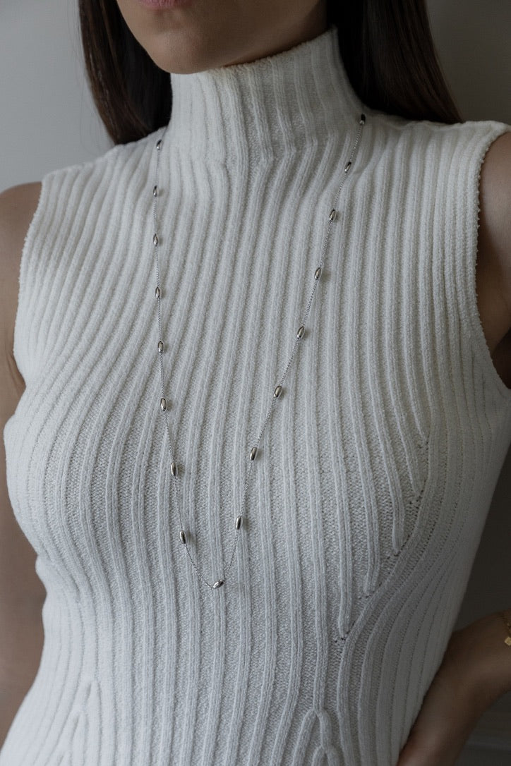 A sleek and modern long necklace featuring polished oval beads spaced along a fine chain. Effortlessly elegant, this piece adds a subtle shine to any look, perfect for layering or wearing solo.